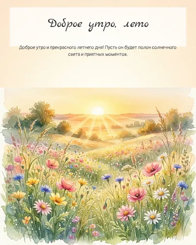 Начните каждое утро с летним настроением, даже если за окном пасмурно! Наша коллекция открыток «Доброе утро, лето!» – это лучики солнца, теплые краски и вдохновляющие сюжеты, которые принесут радость и позитив в ваш день. Отправьте друзьям, близким или коллегам электронное поздравление, чтобы поделиться летним настроением. В нашей подборке вы найдете яркие пейзажи, милые животные, чашечки ароматного кофе на фоне цветущих лугов и многое другое. Каждая открытка создана с любовью, чтобы дарить улыбки и наполнять утро свежестью и бодростью. Позвольте лету ворваться в ваш дом уже с первых минут пробуждения и зарядить энергией на весь день! Ведь что может быть лучше, чем поделиться позитивом и хорошим настроением с теми, кто вам дорог? Выбирайте самые красивые и трогательные изображения, чтобы ваше послание стало по-настоящему особенным. Пусть каждое «Доброе утро, лето!» будет наполнено красотой и вдохновением!