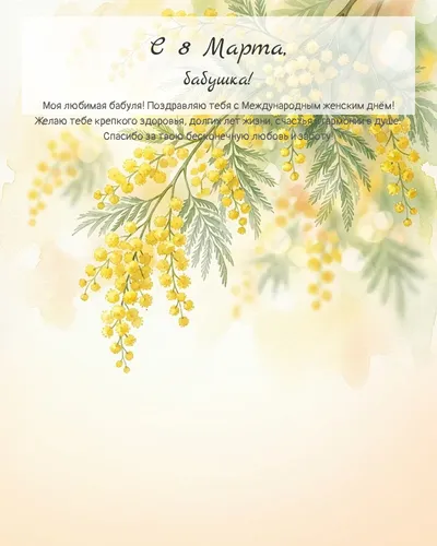 Дорогая бабушка! С 8 Марта тебя, моя родная! Пусть каждый день будет наполнен светом, теплом и улыбками, а весна принесёт много радости и вдохновения. Я тебя очень люблю!