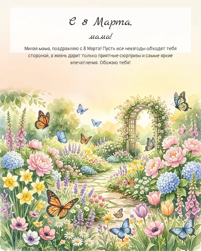 В преддверии Международного женского дня, 8 Марта, весь мир наполняется ароматом весенних цветов и теплыми словами благодарности. Среди всех женщин, одна занимает особое, самое важное место в сердце каждого из нас – это мама. Именно ей мы обязаны жизнью, безграничной любовью, первым уроками и постоянной поддержкой. Хочется выразить ей самые искренние чувства, передать всю нежность и признательность. Наша коллекция открыток-поздравлений создана для того, чтобы помочь вам в этом. Здесь вы найдете яркие и трогательные изображения, дополненные душевными пожеланиями, которые смогут передать всю глубину вашей любви и уважения. От классических цветочных композиций до милых иллюстраций – каждая открытка излучает тепло и заботу, специально подобранные, чтобы сделать этот день незабываемым для вашей мамы. Выбирайте те, что больше всего откликаются в вашем сердце, и подарите своей маме частичку весеннего счастья и тепла.