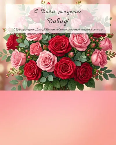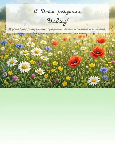 В этот особенный день, по-настоящему светлый и радостный, мы спешим поздравить тебя, дорогой Давид, с Днём рождения! Пусть каждый новый рассвет приносит тебе только хорошее настроение, новые возможности и вдохновение для великих свершений. Мы желаем тебе крепкого здоровья, безграничного счастья, реализации всех самых заветных желаний и огромного везения на жизненном пути. Пусть твои дни будут наполнены любовью, добротой и искренней радостью, а рядом всегда будут верные друзья и любящие близкие. Пусть сбудется всё, о чём ты мечтаешь, и каждый год приносит тебе только процветание и успех. С праздником, Давид!