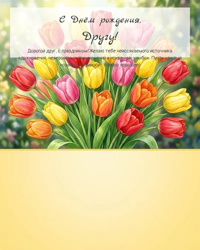 В поисках идеальной открытки, чтобы поздравить дорогого друга с Днем Рождения? Вы попали по адресу! Здесь собрана уникальная коллекция теплых, веселых и искренних поздравлений, способных передать ваши наилучшие пожелания. От классических и трогательных до смешных и оригинальных, каждая открытка создана с любовью, чтобы ваш друг почувствовал себя по-настоящему особенным в этот знаменательный день. Выберите ту, что лучше всего отразит вашу дружбу и подарит незабываемые эмоции. Ведь День Рождения – это прекрасный повод напомнить близкому человеку, как сильно вы его цените и как важна его роль в вашей жизни. Пусть этот день будет наполнен радостью, улыбками и приятными сюрпризами!