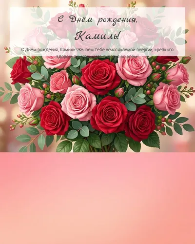 В этот особенный день, когда природа празднует приход нового года, а сердца наполняются радостью и предвкушением, мы хотим поздравить одного из самых замечательных людей, кого мы знаем - нашего дорогого Камиля! Пусть этот день станет началом новой главы, полной ярких событий, незабываемых эмоций и грандиозных достижений. Желаем, чтобы каждый момент был озарен улыбкой, каждый шаг вел к успеху, а мечты сбывались, наполняя жизнь смыслом и счастьем. С Днем рождения, Камиль! Пусть в твоей жизни всегда царят гармония, любовь и процветание.