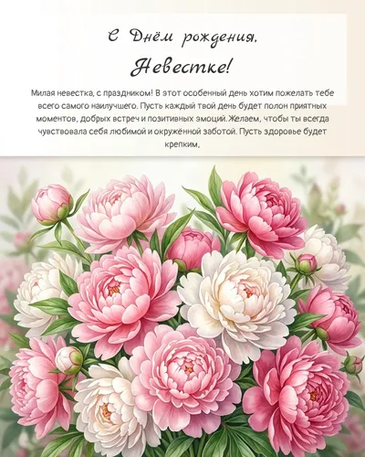 В поисках идеального способа поздравить любимую невестку с днем рождения? Здесь вы найдете теплые слова, которые помогут выразить вашу искреннюю любовь и признательность. Невестка – это не просто жена вашего сына или брата, это член семьи, которая привнесла в ваш дом новые краски и радость. Выберите готовые открытки, или составьте свое уникальное послание, которое растопит сердце вашей невестки. Мы верим, что каждое слово наполнено нежностью и искренними пожеланиями, которые сделают этот день незабываемым. Пусть ваш подарок в виде слов принесёт ей только счастье и улыбки!