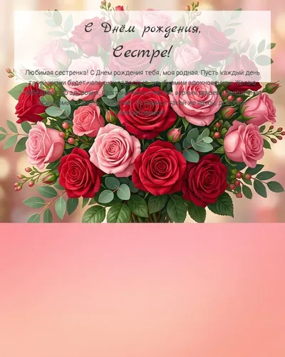 Любимая сестренка! С Днем рождения тебя, моя родная. Пусть каждый день твоей жизни будет наполнен радостью, улыбками и вдохновением. Желаю тебе крепкого здоровья, безграничного счастья, верных друзей и исполнения всех самых заветных желаний. Оставайся такой же яркой, доброй и неповторимой!